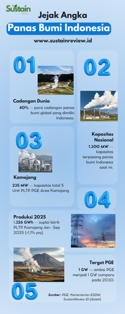 Kamojang di Jawa Barat merupakan simbol perjalanan panjang pengembangan geothermal Indonesia. Area yang pertama kali dieksplorasi pada 1926 itu kini dikelola oleh PT Pertamina Geothermal Energy (PGE) Tbk, dan telah memasok energi bersih ke sistem Jawa-Madura-Bali sejak mulai beroperasi komersial pada 1983.
