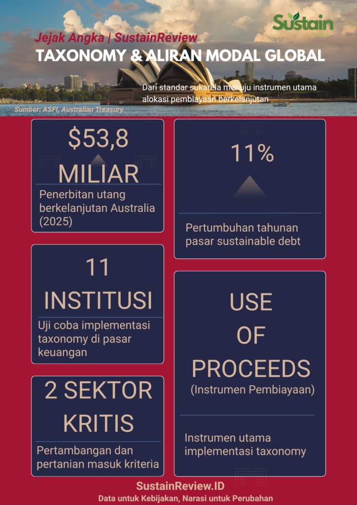 Melalui panduan terbaru yang dirilis oleh Australian Sustainable Finance Institute, Australia mulai mengoperasionalkan taxonomy ke dalam struktur nyata pasar keuangan, khususnya instrumen utang seperti green bonds dan sustainability bonds.