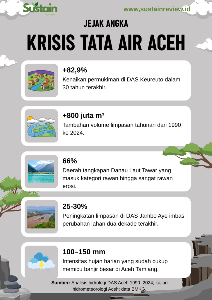 Kondisi tersebut paling terlihat pada DAS Keureuto dan Jambo Aye. Perubahan tata guna lahan dalam tiga dekade terakhir, ekspansi permukiman, lahan terbuka, dan perkebunan, mengubah pola air secara fundamental. Curah hujan yang dulu masih memberi waktu bagi tanah untuk menyerap, kini langsung mendorong debit sungai naik dalam hitungan jam.