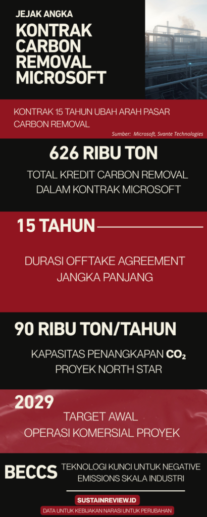 Kesepakatan Microsoft untuk membeli 626.000 ton kredit carbon removal selama 15 tahun dari proyek North Star di Kanada menjadi sinyal kuat. Korporasi kini tidak lagi berburu offset murah, tetapi mengunci pasokan karbon yang bersifat permanen, terukur, dan dapat diverifikasi.