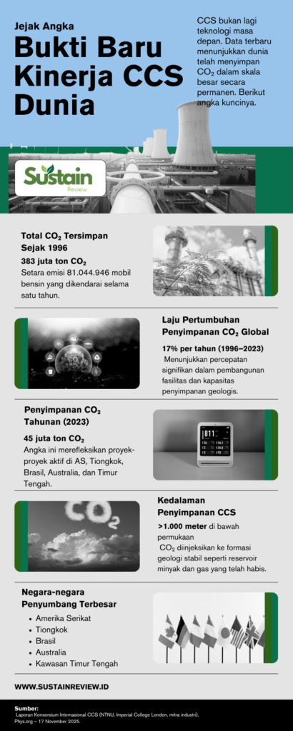 Laporan tahunan pertama dari konsorsium ilmiah-industri global, yang melibatkan Norwegian University of Science and Technology (NTNU), Imperial College London, dan sejumlah mitra industri, mengungkapkan angka penting. Lebih dari 383 juta ton CO₂ telah tersimpan secara permanen sejak 1996. Data ini dirilis 17 November 2025 dan dikutip dari Phys.org.