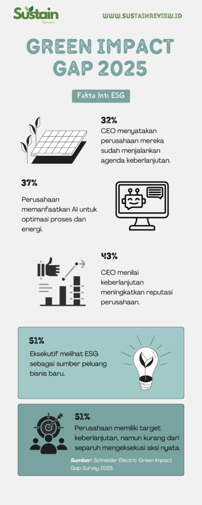 KEBERLANJUTAN bergerak cepat dari ruang diskusi pinggiran menjadi pusat strategi bisnis. Survei Schneider Electric Green Impact Gap 2025 menunjukkan transformasi yang semakin matang di ruang direksi perusahaan Indonesia.