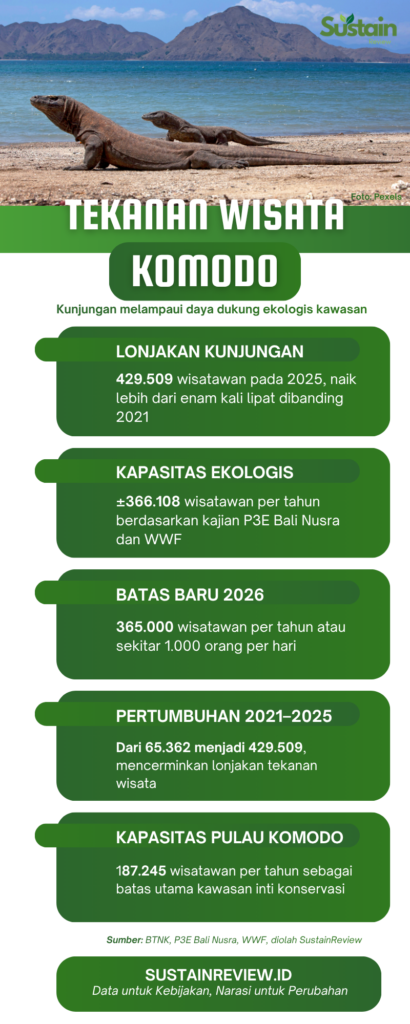 Data Balai Taman Nasional Komodo (BTNK) menunjukkan tren yang jelas. Kunjungan melonjak dari 65.362 wisatawan pada 2021 menjadi 429.509 pada 2025. Lonjakan lebih dari enam kali lipat dalam empat tahun. Sementara itu, kapasitas ekologis kawasan, berdasarkan kajian bersama P3E Bali Nusra dan World Wide Fund for Nature, berada di kisaran 366 ribu pengunjung per tahun.