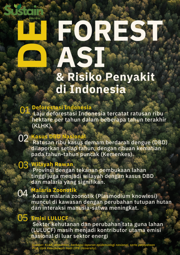 Hutan juga berfungsi sebagai penyerap karbon. Ketika hutan hilang, emisi meningkat. Perubahan iklim memperluas sebaran geografis vektor penyakit. Artinya, deforestasi dan krisis kesehatan saling menguatkan.