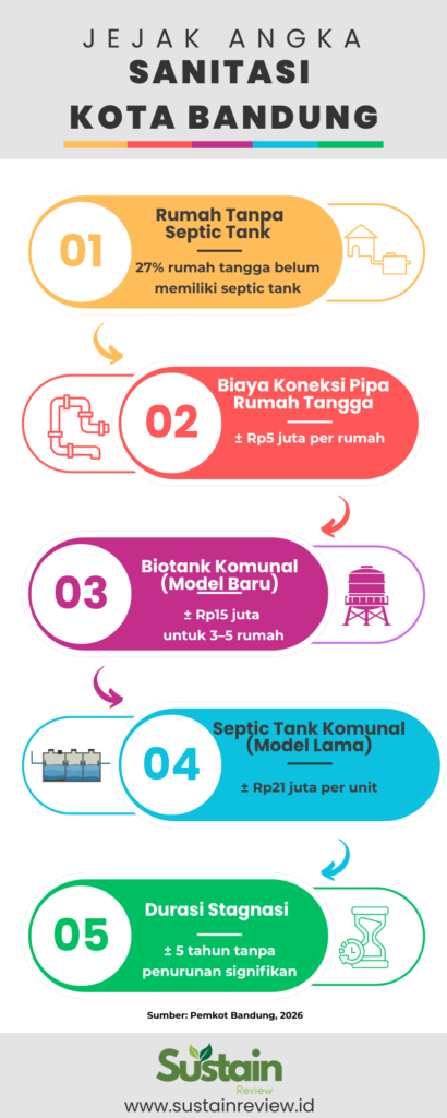 DI TENGAH modernisasi ruang kota, satu angka mengusik fondasi dasar layanan publik. Sekitar 27 persen rumah tangga di Kota Bandung belum memiliki septic tank. Lebih mengkhawatirkan, angka itu tidak menunjukkan penurunan signifikan dalam lima tahun terakhir.