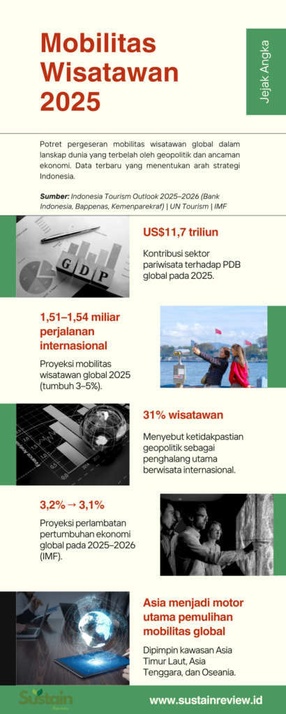 Untuk satu pekan ke depan, SustainReview menurunkan laporan serial bertajuk “Masa Depan Pariwisata Indonesia 2025–2026.” Serial ini membedah arah baru pariwisata global dan nasional melalui perspektif ekonomi, geopolitik, iklim, investasi, hingga transformasi teknologi. Seluruh laporan disusun tim redaksi berdasarkan data resmi, termasuk Indonesia Tourism Outlook 2025–2026, laporan bersama Bank Indonesia, Kementerian Pariwisata, dan Bappenas.