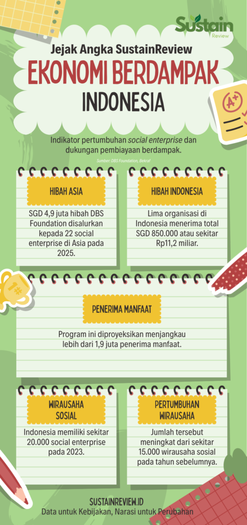 DBS Foundation, misalnya, kembali menyalurkan hibah sebesar SGD 4,9 juta atau sekitar Rp65 miliar kepada 22 social enterprise di Asia pada 2025. Dari jumlah itu, lima organisasi di Indonesia menerima total SGD 850.000 atau sekitar Rp11,2 miliar untuk memperluas dampak sosial mereka.