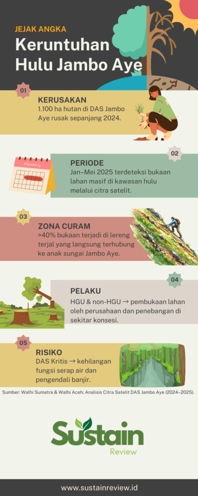 Analisis citra satelit periode Januari hingga Mei 2025 memperlihatkan bukaan lahan yang meluas hingga ke kawasan curam yang terhubung langsung dengan anak-anak sungai menuju Sungai Jambo Aye. Di wilayah seperti ini, setiap hektare hutan yang hilang berarti hilangnya kemampuan tanah menyerap dan menahan air hujan.
