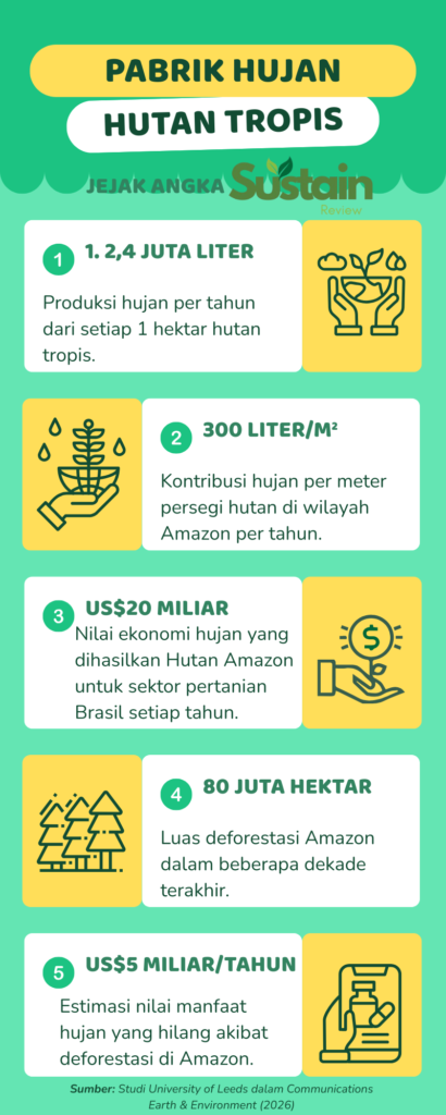 Penelitian berjudul Quantifying tropical forest rainfall generation yang dipublikasikan di Communications Earth & Environment menghitung bahwa setiap satu hektar hutan tropis menghasilkan sekitar 2,4 juta liter hujan per tahun. Di Amazon, angkanya bahkan lebih tinggi, sekitar 300 liter per meter persegi per tahun.