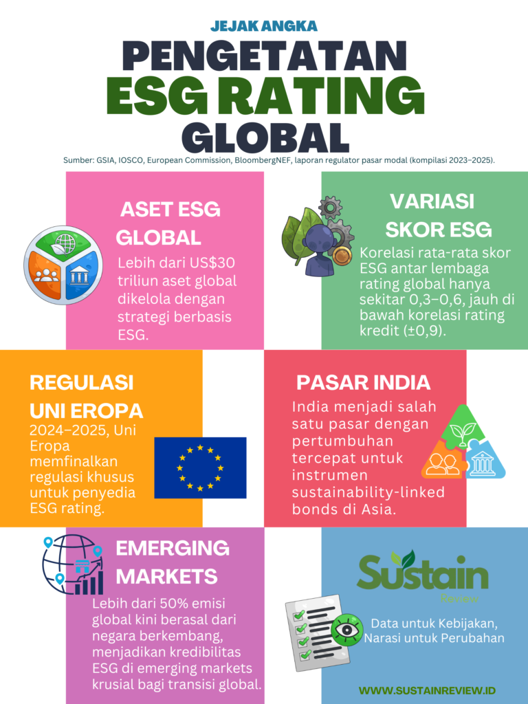 Langkah terbaru datang dari pengetatan pengawasan ESG rating oleh Securities and Exchange Board of India (SEBI). Regulator pasar modal India itu membentuk kelompok kerja untuk meninjau ulang kerangka regulasi penyedia ESG rating. Mandatnya mencakup penguatan transparansi metodologi, peningkatan konsistensi penilaian, serta perbaikan tata kelola dan manajemen konflik kepentingan di industri pemeringkatan.
