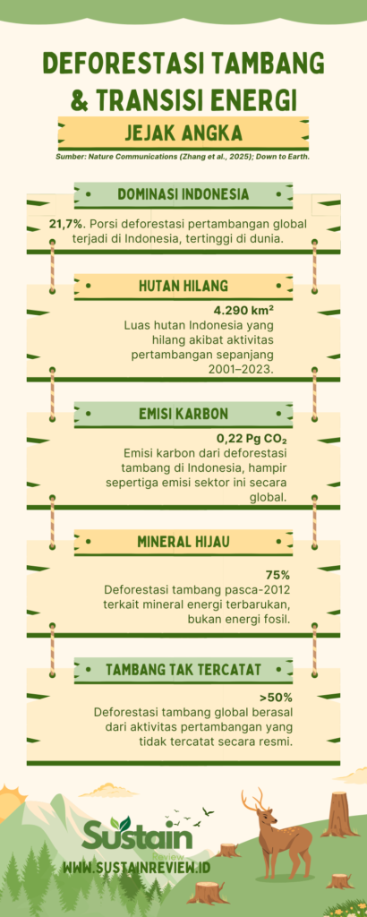 Dalam lanskap global tersebut, Indonesia muncul sebagai episentrum deforestasi tambang abad ke-21. Analisis yang dirujuk oleh Down to Earth menyoroti bahwa lonjakan deforestasi pasca-2012 terutama berkaitan dengan tambang mineral untuk energi terbarukan, bukan energi fosil, sebuah pola yang relevan dengan dinamika ekspansi nikel di Indonesia.