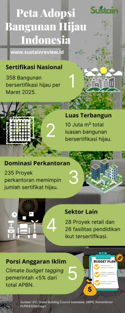 Data terbaru International Finance Corporation (IFC) dan Green Building Council Indonesia (GBCI) menunjukkan, hingga Maret 2025 baru 358 bangunan yang mengantongi sertifikasi hijau. Total luasnya sekitar 10 juta meter persegi, angka yang sangat kecil dibandingkan ekspansi konstruksi nasional setiap tahunnya.