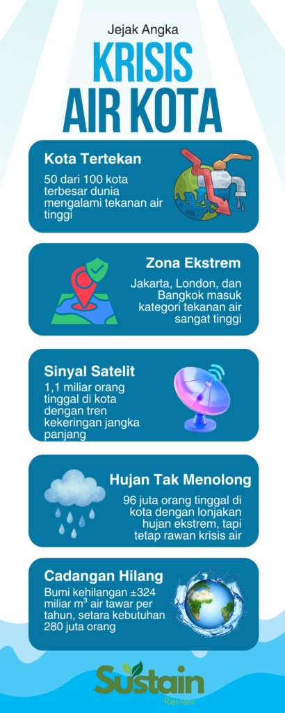 Tekanan air ekstrem berarti kota menggunakan cadangan air lebih cepat dari kemampuan alam memulihkannya. Dalam jangka pendek krisis ini tak selalu terlihat. Air masih mengalir. Sumur masih memompa. Tetapi secara hidrologis, kota sedang hidup dari “utang air”.