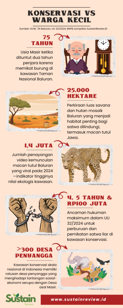 DI SITUBONDO, Jawa Timur, seorang pria lanjut usia bernama Masir harus menghadapi tuntutan dua tahun penjara karena memikat burung di kawasan Taman Nasional Baluran. Usianya 75 tahun. Keterlibatannya bukan bagian dari jaringan perdagangan satwa liar, bukan pula pembalakan skala besar. Ia hanya warga desa penyangga yang hidup berdampingan dengan hutan sejak kecil.