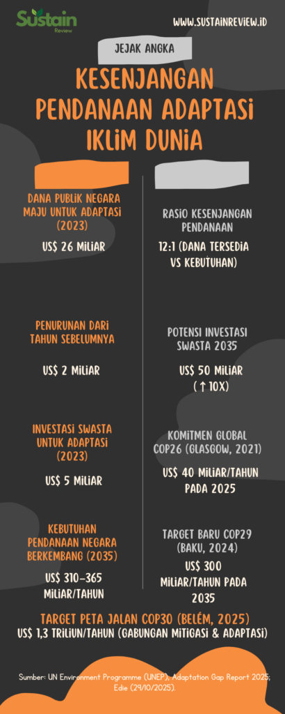 Menurut laporan Adaptation Gap Report 2025 yang dikutip dari Edie (29 Oktober 2025), total pendanaan publik untuk adaptasi global saat ini baru mencapai seperlima dari kebutuhan sebenarnya. Negara berkembang diperkirakan membutuhkan 310 hingga 365 miliar dolar AS per tahun pada 2035, atau sekitar 12 kali lipat lebih besar dari dana yang ada sekarang.