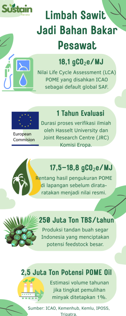 ICAO menetapkan nilai LCA POME sebesar 18,1 gCO₂e/MJ, jauh di bawah avtur fosil. Angka ini menjadi “default value” yang dapat dipakai produsen SAF global untuk menghitung emisi reduksi mereka.