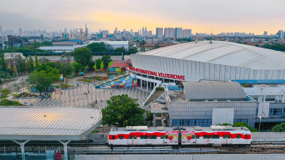 Foto: Dok. LRT Jakarta – Rangkaian LRT Jakarta melintas di kawasan Velodrome, Jakarta Timur. Transportasi publik berbasis listrik ini diproyeksikan berkontribusi pada penurunan emisi karbon perkotaan.
