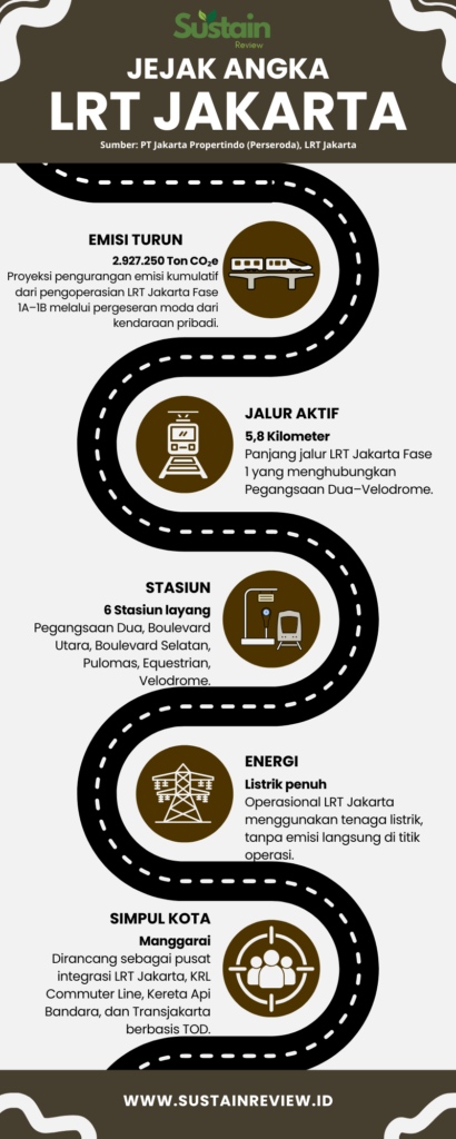 Proyeksi pengurangan emisi hingga 2,9 juta ton CO₂e dari pengoperasian LRT Jakarta Fase 1A dan 1B menempatkan transportasi publik dalam kerangka baru. Infrastruktur tidak lagi dipahami sebagai proyek fisik semata, tetapi sebagai instrumen mitigasi karbon perkotaan.