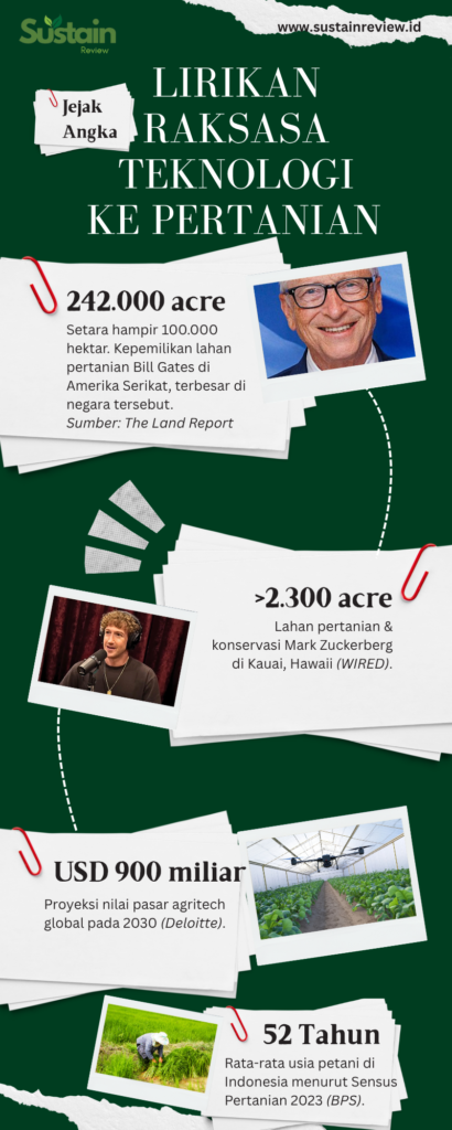 Bill Gates adalah contoh paling mencolok. Mengutip The Land Report, ia kini menjadi pemilik lahan pertanian terbesar di Amerika Serikat, dengan kepemilikan mencapai sekitar 242.000 acre atau hampir 100.000 hektar.