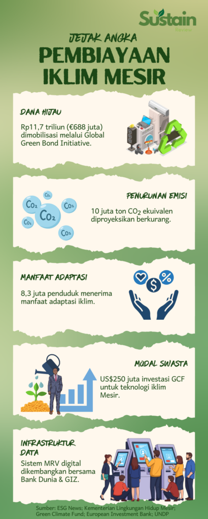 MESIR mengunci langkah strategis dalam pembiayaan iklim global. Melalui Global Green Bond Initiative, Kairo memobilisasi pendanaan sekitar Rp11,7 triliun (setara €688 juta) untuk memperkuat ketahanan iklim nasional sekaligus mendukung agenda penurunan emisi jangka panjang. Langkah ini menandai pergeseran penting, iklim tidak lagi diperlakukan sebagai agenda lingkungan semata, tetapi sebagai fondasi kebijakan pembangunan.