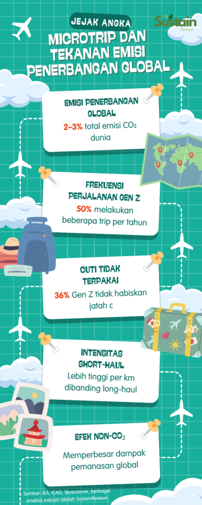 Tanpa cuti panjang, biaya lebih terkendali, dan pengalaman tetap didapat. Namun dari perspektif sistem, pola ini menciptakan tekanan baru pada sektor transportasi udara yang sudah menjadi salah satu kontributor emisi global.