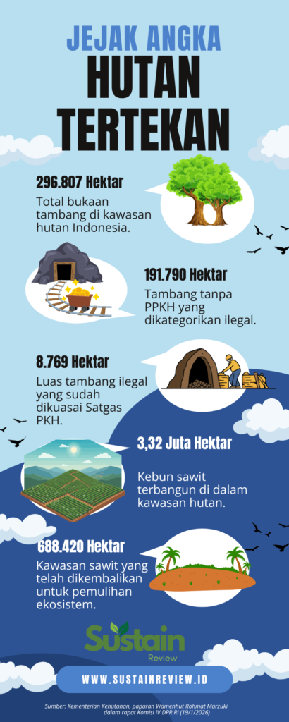 Kementerian Kehutanan memaparkan luasan pertambangan di kawasan hutan yang mencapai 296.807 hektare. Hampir dua pertiganya tidak berizin. Data ini adalah potret tata kelola sumber daya alam yang rapuh di jantung kawasan hutan Indonesia.