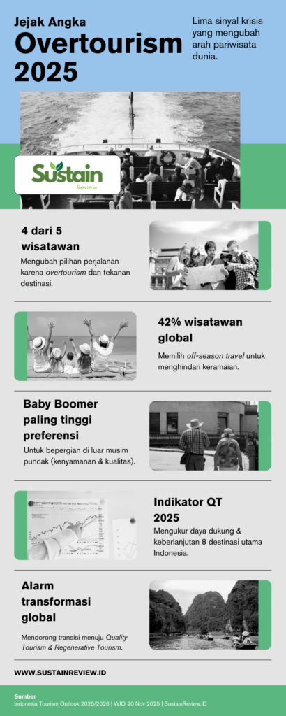 Fenomena ini bukan lagi isu lokal, melainkan gelombang global. Menurut Indonesia Tourism Outlook 2025/2026, empat dari lima wisatawan kini mengubah pilihan perjalanan karena overtourism, memilih destinasinya berdasarkan tingkat keramaian, kenyamanan, dan risiko tekanan lingkungan.