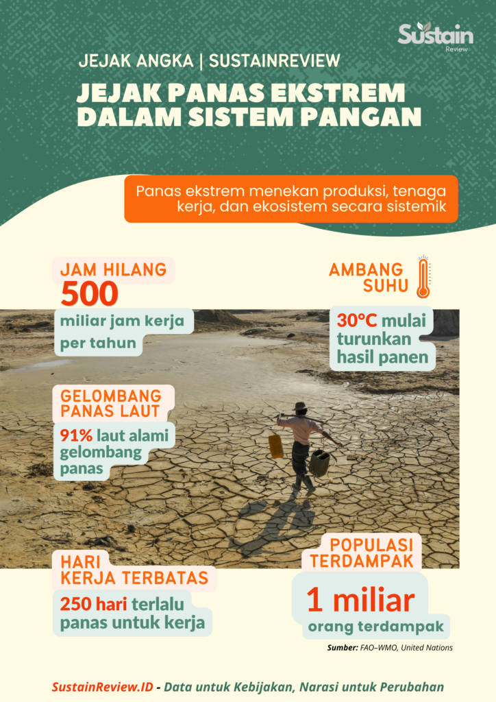 Panas ekstrem bekerja sebagai pengganda risiko. Panas ini Tidak berdiri sendiri, tetapi memperburuk tekanan yang sudah ada dalam sistem pangan.