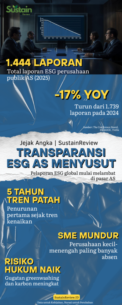 PENURUNAN laporan keberlanjutan di Amerika Serikat menandai perubahan struktural dalam tata kelola korporasi global. Perusahaan mulai menahan transparansi akibat meningkatnya risiko hukum dan melemahnya tekanan investor, yang pada akhirnya berpotensi mempersempit visibilitas rantai pasok global, termasuk yang melibatkan Indonesia.