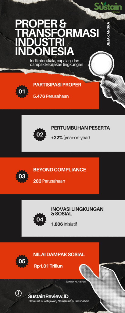Dengan ribuan perusahaan dari berbagai sektor, PROPER telah berkembang menjadi salah satu instrumen tata kelola lingkungan terbesar di Indonesia. Transparansi berbasis peringkat, mulai Emas, Hijau, Biru, Merah, hingga Hitam, menciptakan tekanan reputasi yang nyata.