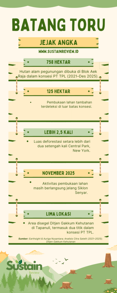 Sebagian area yang teridentifikasi berada di dalam konsesi PT Toba Pulp Lestari, pemasok utama bubur kayu untuk industri serat tekstil global. Riset mencatat bahwa antara Maret 2021 hingga 1 Desember 2025, sekitar 758 hektare hutan alam pegunungan di Blok Aek Raja telah dibuka. Selain itu, sekitar 125 hektare pembukaan lahan terdeteksi meluas hingga ke luar batas konsesi.