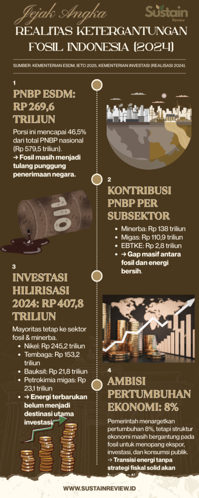 Data terbaru memperlihatkan skala ketergantungan itu. Pada 2024, penerimaan negara bukan pajak (PNBP) dari sektor energi dan sumber daya mineral mencapai Rp269,6 triliun, atau 46,5% dari total PNBP nasional. Migas menyumbang Rp110,9 triliun, minerba Rp138 triliun, dan EBTKE hanya Rp2,8 triliun.