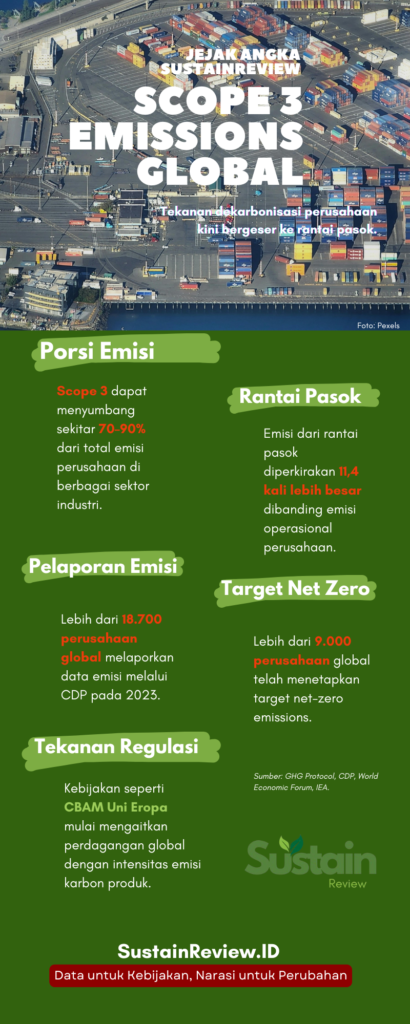 Menurut data dari CDP, Scope 3 emissions rata-rata menyumbang sekitar 70–90 persen dari total jejak karbon perusahaan di berbagai sektor industri.