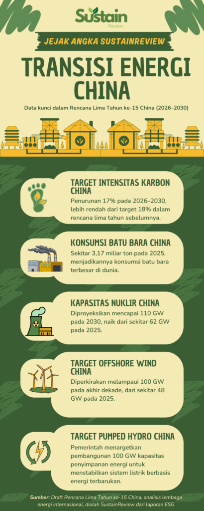 Batu bara tetap sangat dominan dalam sistem energi China. Pada 2025 negara ini mengonsumsi sekitar 3,17 miliar ton batu bara. Rencana baru hanya menargetkan penggantian sekitar 30 juta ton per tahun dengan energi yang lebih bersih.