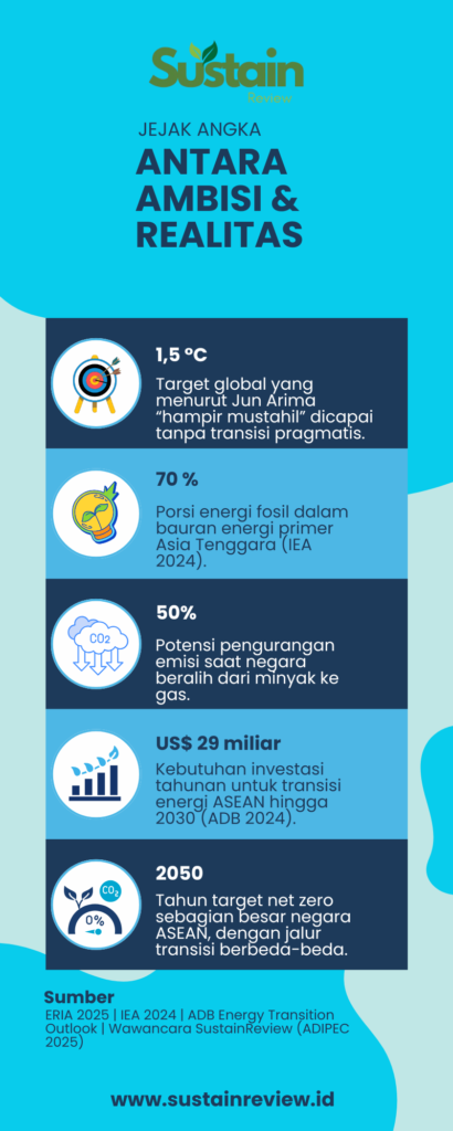 Arima menilai kesenjangan antara ambisi dan kapasitas masih terlalu lebar, terutama di Asia Tenggara. Negara-negara di kawasan ini menghadapi realitas ganda, kebutuhan energi yang terus tumbuh dan ketergantungan tinggi pada bahan bakar fosil.