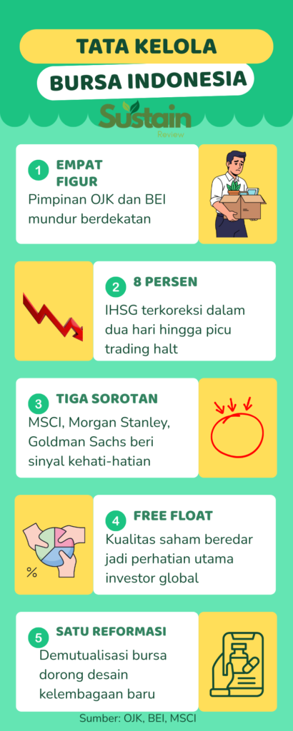 Ketika lembaga keuangan besar seperti Morgan Stanley dan Goldman Sachs ikut menurunkan pandangan, persepsi risiko pasar meningkat. Tekanan eksternal ini kemudian beririsan dengan dinamika kepemimpinan di regulator dan pengelola bursa. Yang dipertanyakan bukan hanya kinerja harian pasar, melainkan ketahanan desain kelembagaan dalam menjawab standar global yang makin ketat.